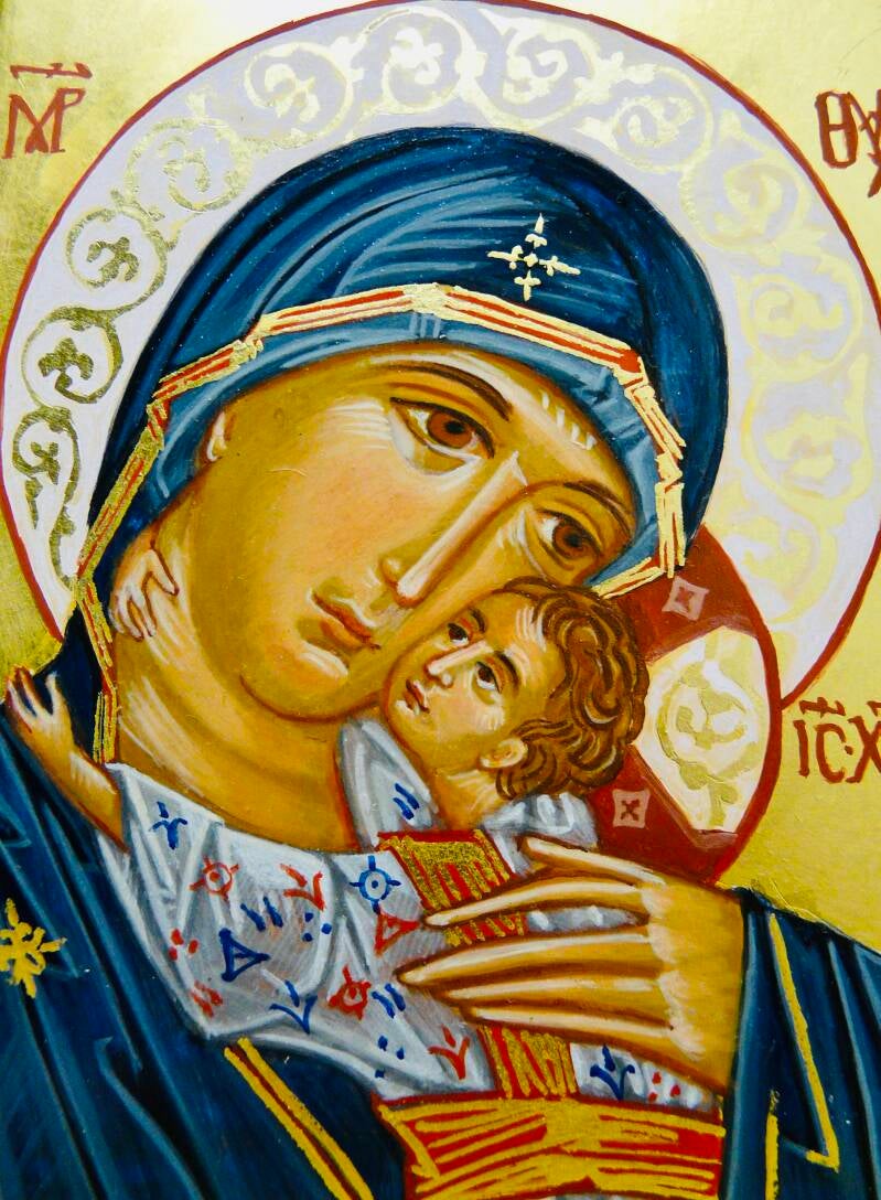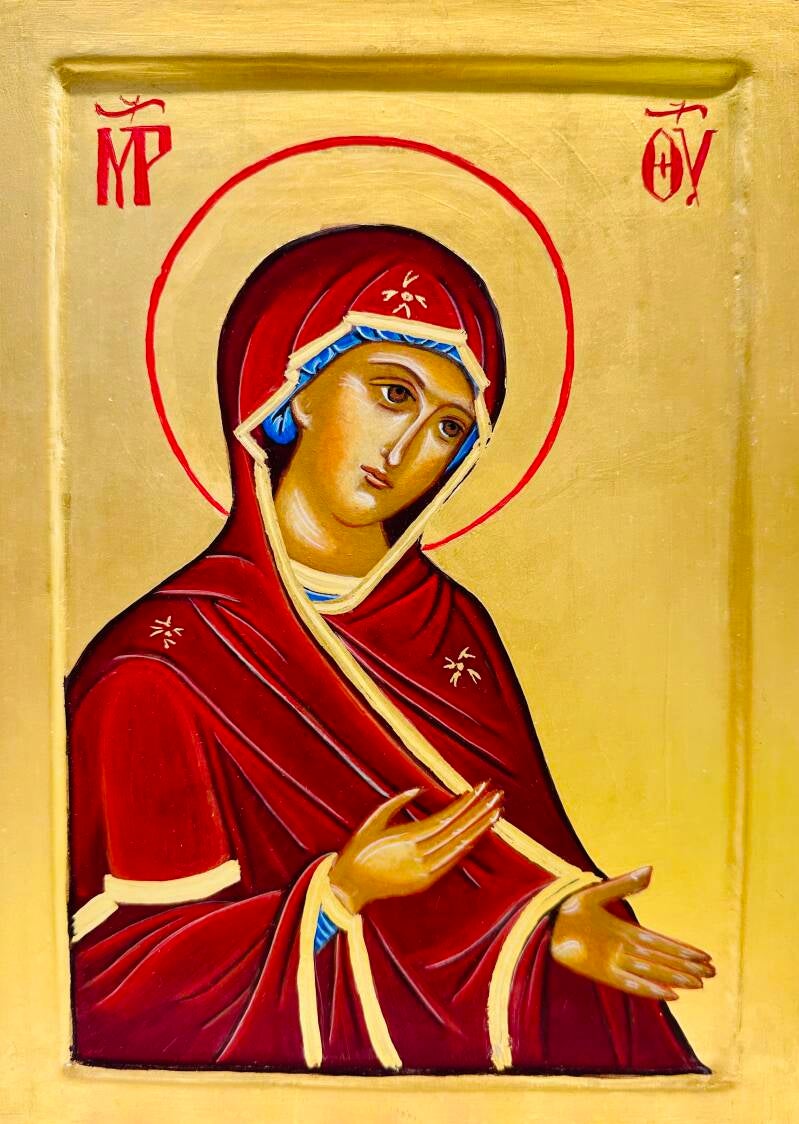 J'ai choisis de peindre cette Vierge car elle intercède en faveur de la personne qui la prie auprès de son fils, Jésus. En effet, je traversais une période d'épreuves. J'avais besoin de l'appui de Marie pour m'accompagner sur le chemin du deuil de mon père et de ma grand-mère et sur celui du cancer de ma mère. En deux ans, j'avais perdu les membres de ma famille proche, il ne restait que ma mère, malade. Peindre cette icône m'a permis de garder espoir. Juillet 2022, atelier de Véronique Vié.