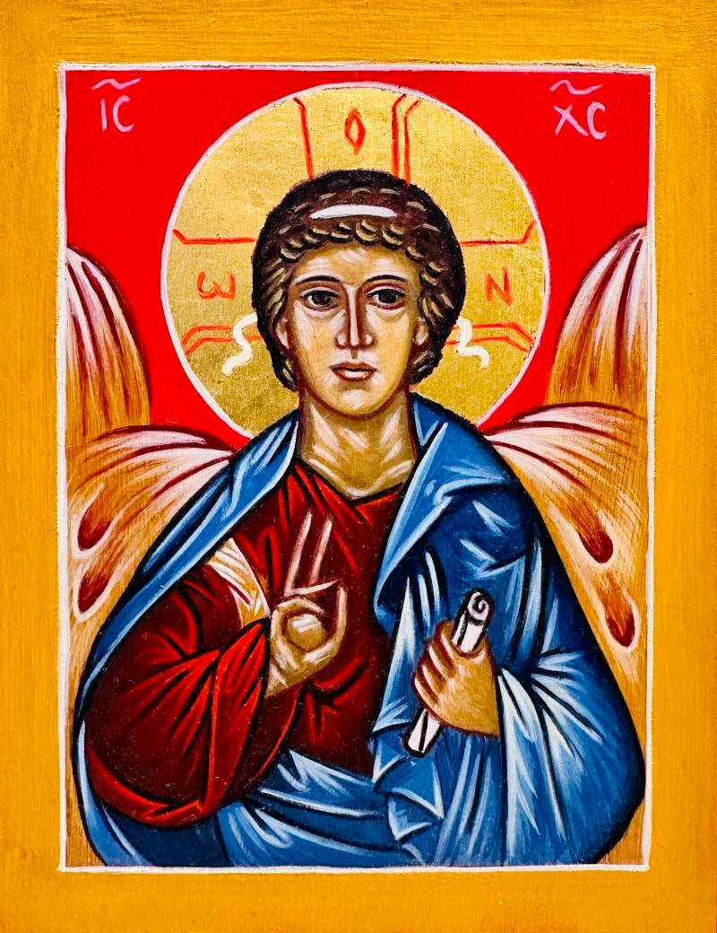 Cet automne-là, ma mère débutait six mois de chimiothérapie après une première opération de son cancer. L'épuisement d'un été marqué par les angoisses liées aux diagnostics médicaux, me faisait redouter ces six mois. Écrire cette icône m'a soutenue dans l'épreuve. Grâce à elle, j'ai rendu hommage à ma mère. Aujourd'hui, elle est accrochée dans sa chambre et veille sur sa santé retrouvée. Octobre 2022, atelier d'Olga Zakayana-Astorg.