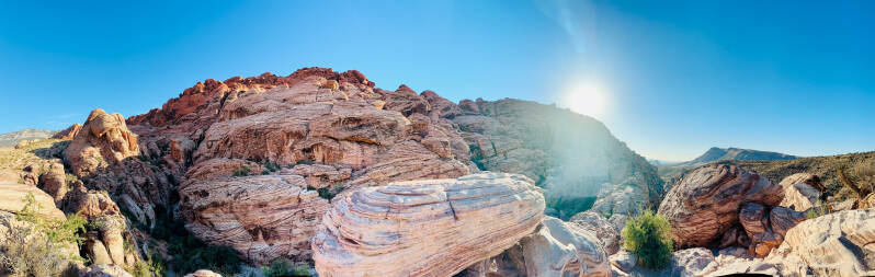 De temps en temps, je m’arrête pour toucher la roche. À l’ombre, elle reste étonnamment fraîche. À Red Rock Canyon, la roche est composée de grains de sable qui se sont durcis sous l’effet de l'aridité. Il y a quelques milliers d’années, se dressaient ici des dunes. D’ailleurs, les rares fois où il pleut, suffisent à rendre la roche friable… Elle redevient sable !
