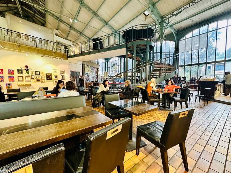 Au pied du Square Louise-Michel, se niche un lieu de culture dans une ancienne halle. Dans cet espace se trouve une librairie dédiée à l’art, des expositions et… un café !