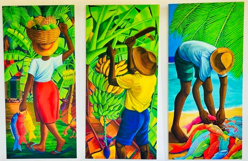 Je contemple les oeuvres de Georges Camille qui représentent ici des scènes de la vie aux Seychelles. D’autres tableaux sont dédiés aux poissons que l’on peut voir autour de la barrière de corail. Je retrouve la palette de couleurs des îles lorsque le soleil les illumine. Alors, les paysages et les êtres sont baignés d’une douce joie… Sublime !