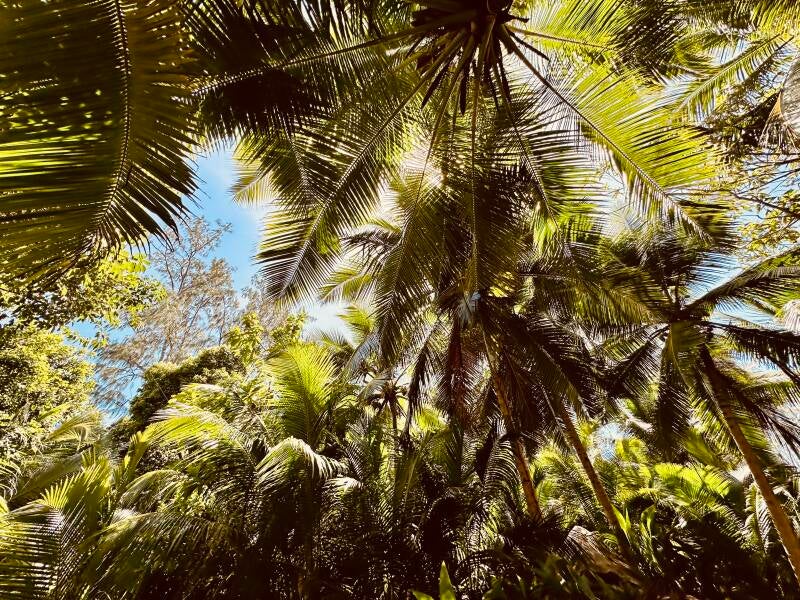 Ce matin, je prends mon petit-déjeuner sur la plage avant de partir pour une petite excursion en direction de la Pointe Ramasse-Tout. Les randonnées sont d’un niveau difficile à Silhouette car l’île est sauvage, peu balisée et les sentiers sont très escarpés. Je choisis la plus facile car elle dure environ une heure et me permettra de me baigner ensuite. Les autres randonnées ont une durée de 5h et plus… Pour mon dernier jour ici, j’opte pour un mix randonnée et piscine !